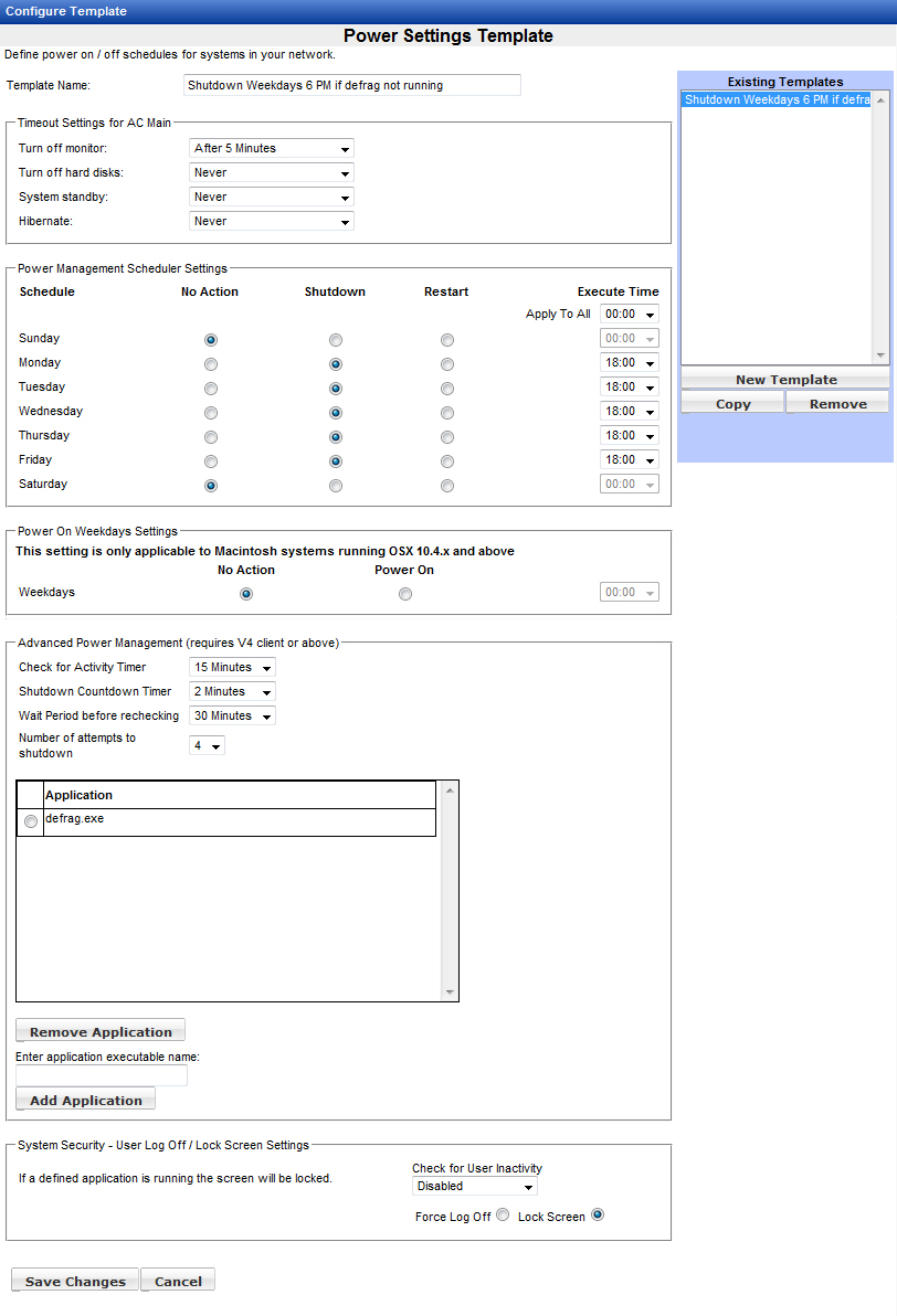 Management Utility allows power management settings, including scheduled shutdowns or restarts, to be applied to client systems using a Power Settings Template. A list of applications can be defined as a part of the template, so that a scheduled shutdown or restart will not occur if one of the listed applications is running.