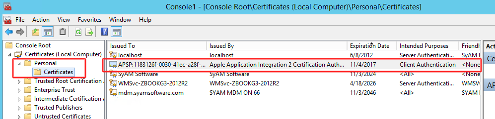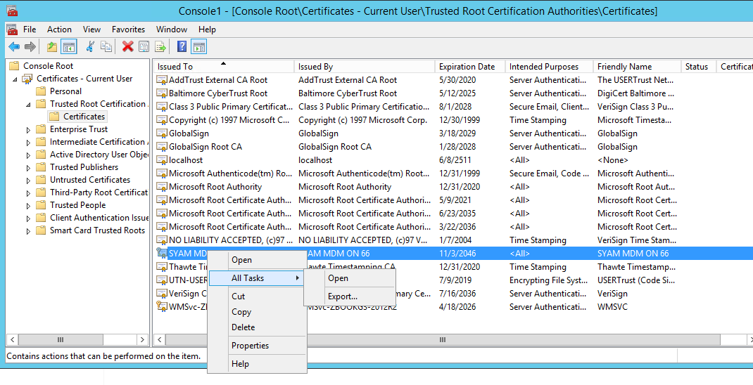 Select the MDM Trusted Certificate and press the Right Mouse button to bring up the menu, choose All Tasks and Export