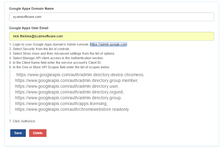 Enter the domain and Google Apps email address you are using to log into the Google Admin Console