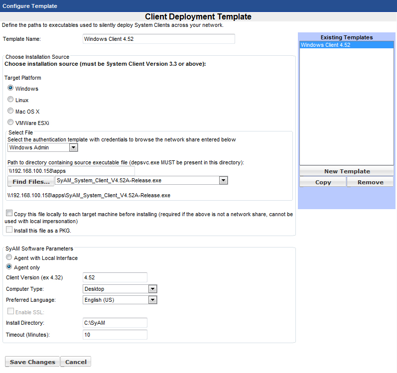 Select the target OS and the corresponding authentication template, then type the path to the directory that contains the client executable. Click the Find Files button to populate the drop down menu where you can choose the correct executable file.