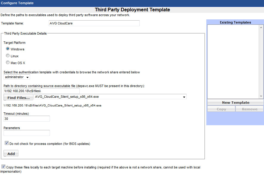 In Management Utility, create a Third Party template. Enter a template name. Select the target platform and authentication template. Enter the Default Application Path if it is not already filled in. Click the Find Files button and choose the installation executable from the drop down menu.