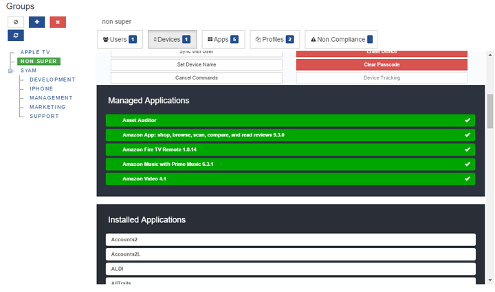 When viewing the device details the Managed Applications will be shown in Green and all Installed Applications, managed and Non Managed are listed in White