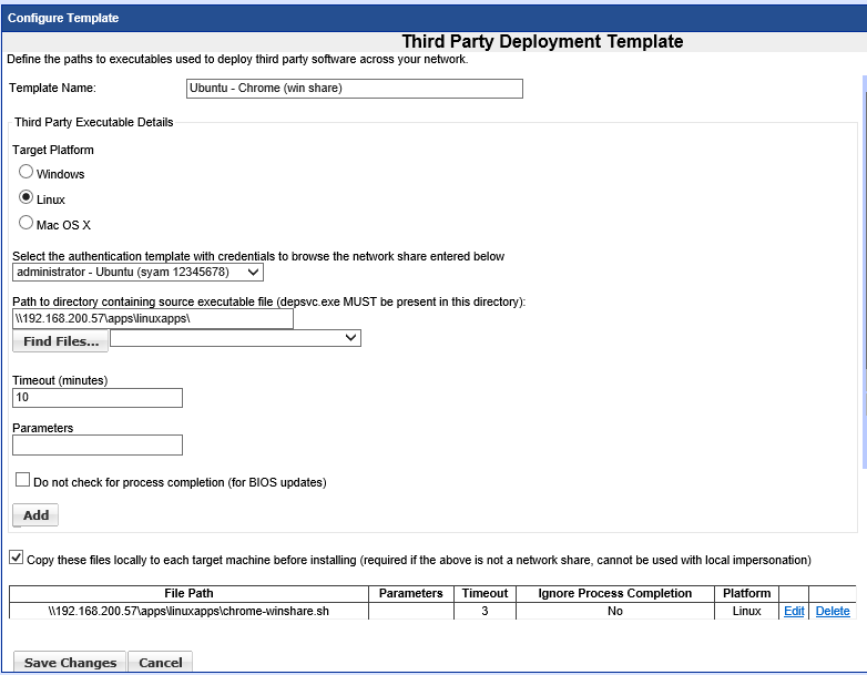 Give the template a name, select Linux, choose the Authentication Template that contains the username and password for both Windows App share file access the root level user on the Linux target system