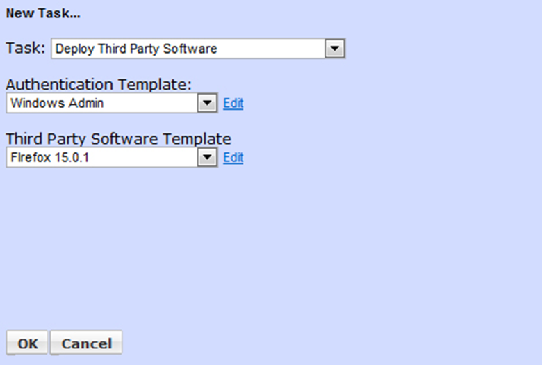 In the New Task box, choose the Windows authentication template and the newly created Firefox deployment template. Click OK.