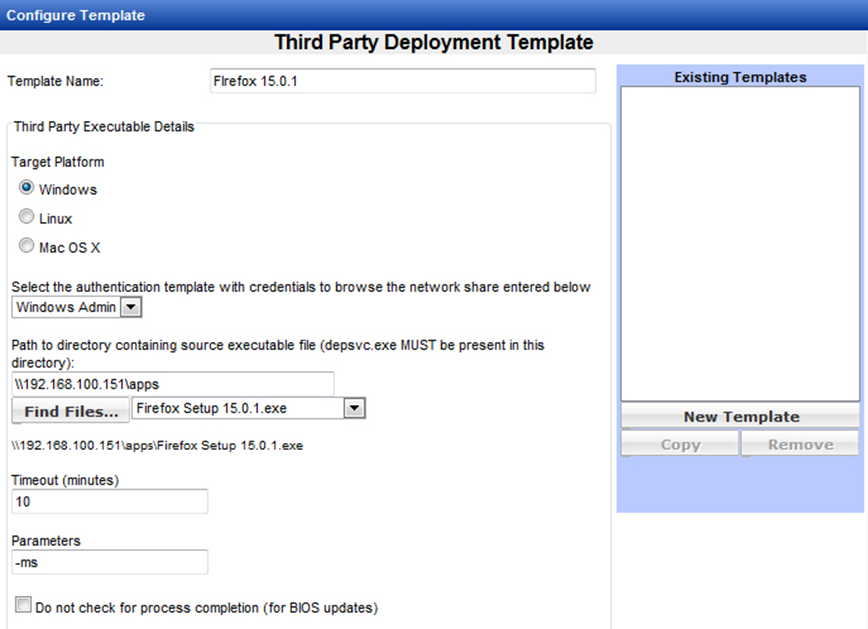 In Management Utility, create a Third Party template. Enter a template name. Choose Windows as the target platform and select the correct authentication template. Enter the path to the network share containing the source executable file; this will already be present if the default path has been entered in Administration Settings. Click the Find Files button and choose the Firefox installation executable from the drop down menu.