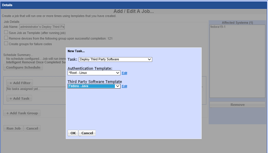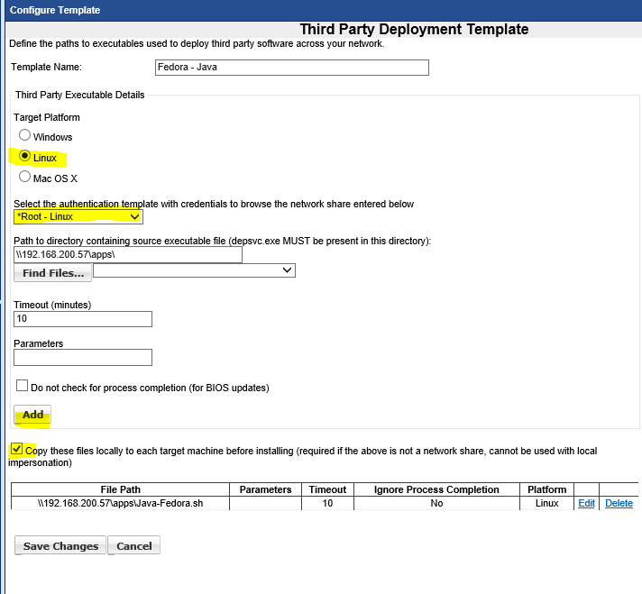 Give the template a name, select Linux, choose the Authentication Template that contains the username and password for both Windows App share file access the root level user on the Linux target system