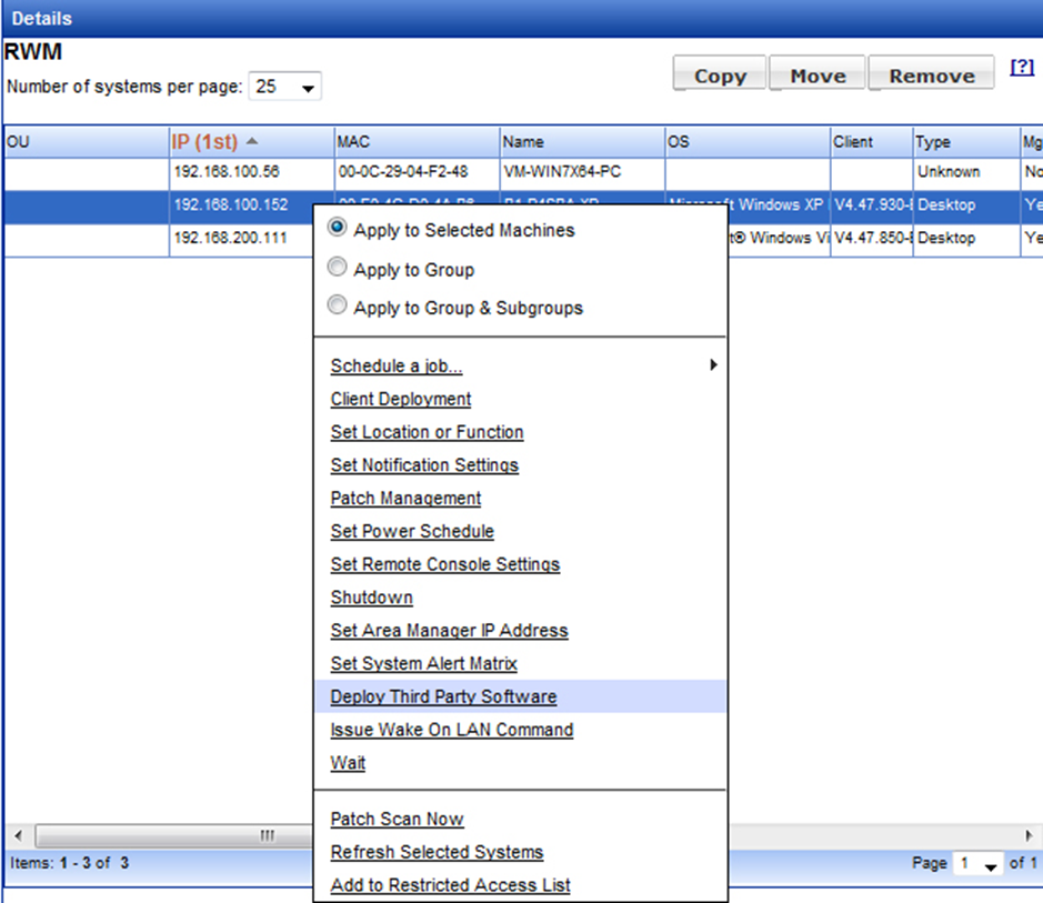 Now you can test deployment to a single system. Select a system in the Groups area. Click the system row, then right-click to display the context menu. From the menu, choose Deploy Third Party Software.