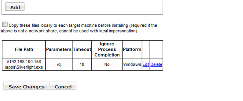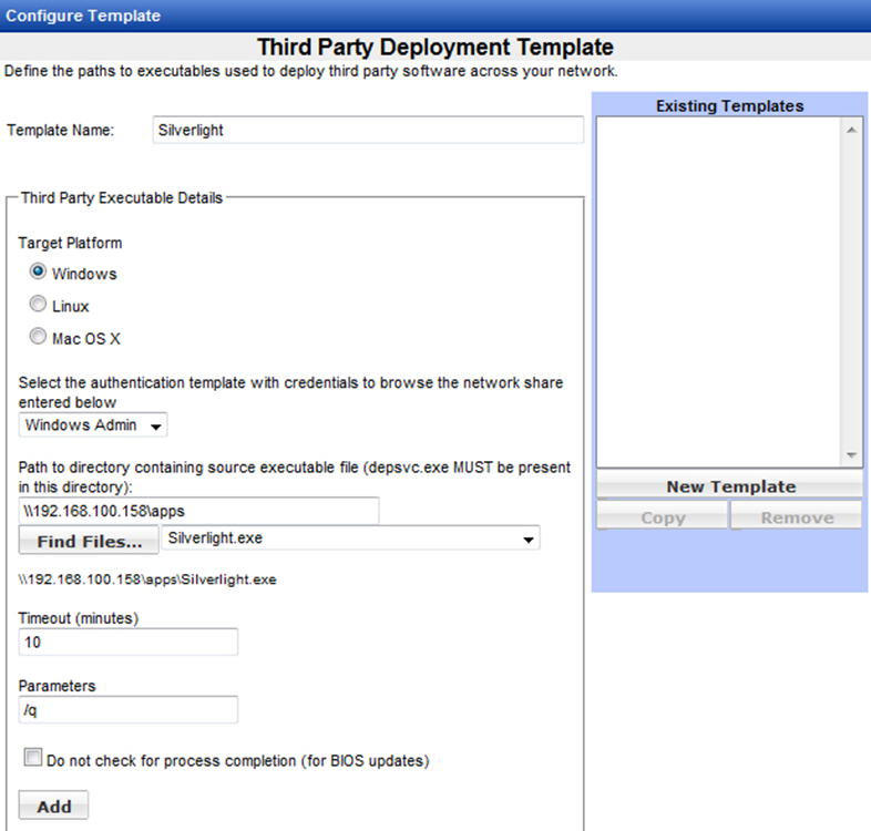 In Management Utility, create a Third Party template. Enter a template name. Choose Windows as the target platform and select the correct authentication template. Enter the path to the network share containing the source executable file; this will already be present if the default path has been entered in Administration Settings. Click the Find Files button and choose the Silverlight installation executable from the drop down menu.