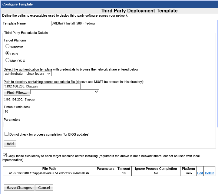 Give the template a name, select Linux, choose the Authentication Template that contains the username and password for both Windows App share file access the root level user on the Linux target system