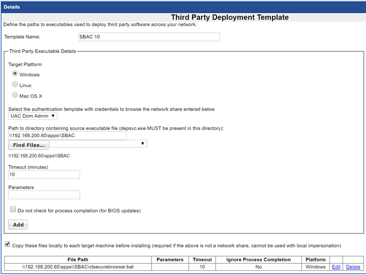 **PLEASE NOTE if target systems have UAC enabled then use the Authentication template for UAC, also make user the Management Utilities Service is running as the username defined in the UAC Authentication template and check off Copy these files locally in the Third Party template