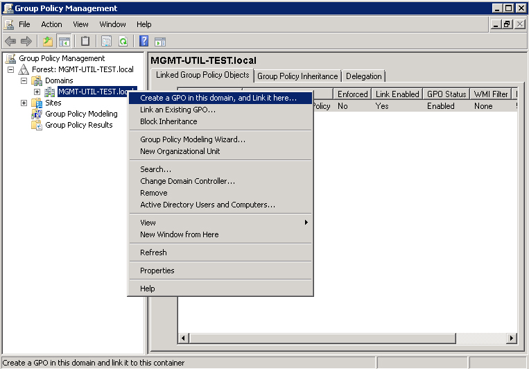 In the Console Tree at the left side of the Group Policy Management interface, navigate to Forest: <forest name> - Domains. Right-click the domain name, and in the menu, choose Create a GPO in this domain, and Link it here.