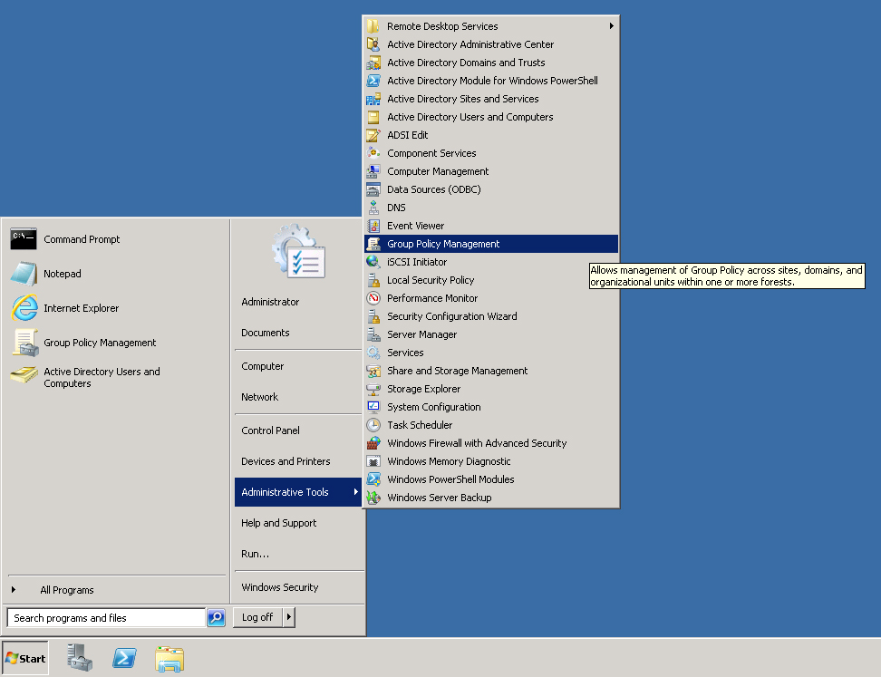 In the Start menu, go to Administrative Tools – Group Policy Management.