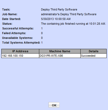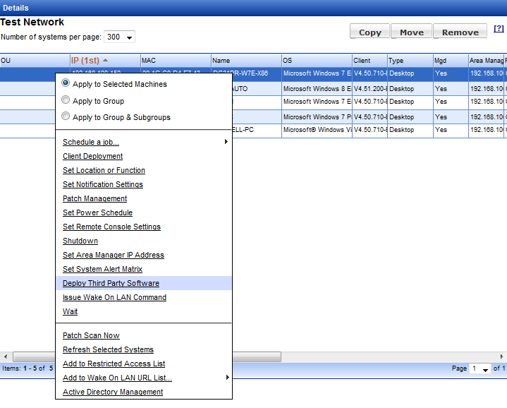 Now you can test deployment to a single system. Select a system in the Groups area, keeping in mind that the batch script may reboot the system. Click the system row, then right-click to display the context menu. From the menu, choose Deploy Third Party Software.