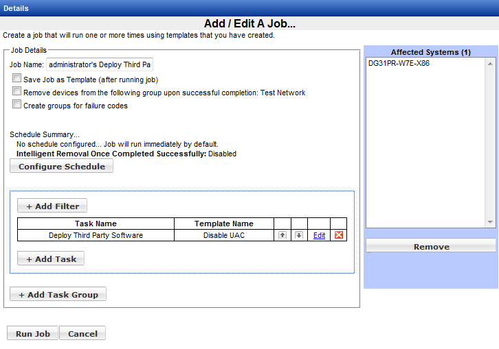 Once you have deployed successfully on a single machine, you can use the Groups context menu options to deploy the batch script on multiple client machines, either as a one-time job run on demand, or a recurring scheduled job. Because the batch script performs a reboot after disabling UAC, you will want to make sure the job runs at a time when a reboot is acceptable.