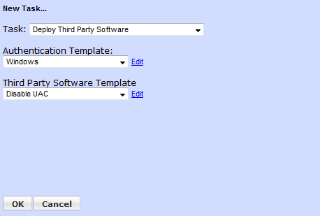 In the New Task box, choose the Windows authentication template and the newly created Disable UAC template. Click OK.