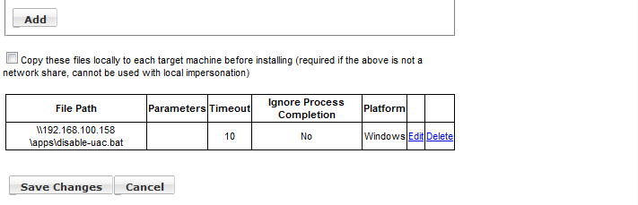 Save the batch script file (in our example we use the filename disable-uac.bat) and place the file in the default application directory defined on the Administration Settings page of Management Utility.