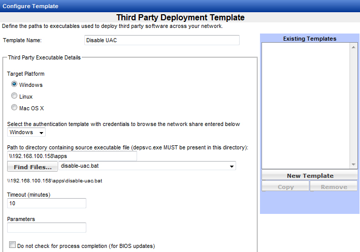 In Management Utility, create a Third Party template. Enter a template name. Choose Windows as the target platform and select the correct authentication template. Enter the path to the network share containing the source executable file; this will already be present if the default path has been entered in Administration Settings. Click the Find Files button and choose the batch script file from the drop down menu.