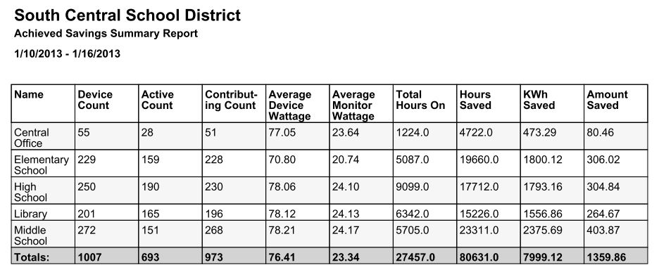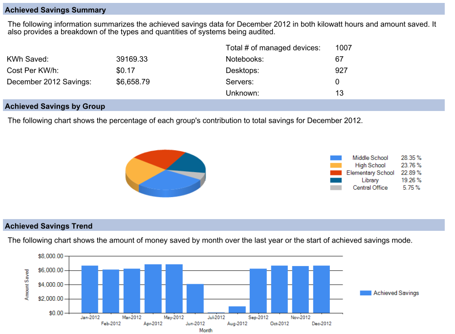 A power audit will create an accurate baseline to report exactly how many killowatts are used on a regular basis. This baseline is then compared to the power management polices that would be implemented. By creating an accurate baseline of current power consumption, and comparing that to what should be saved in the future after activating power management policies, we can present you with an achieved vs projected savings chart. This chart will compare how much you planned on saving vs how much you actually have saved. In some cases companies save even more than expected. An example is on page 6.