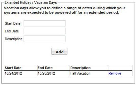 For holidays and vacation periods you can set a range of dates in Extended Holiday/Vacation Days. On any day specified here, a system that is powered off all day will not be included in savings calculations. A system that is powered on for any part of the day will be included.