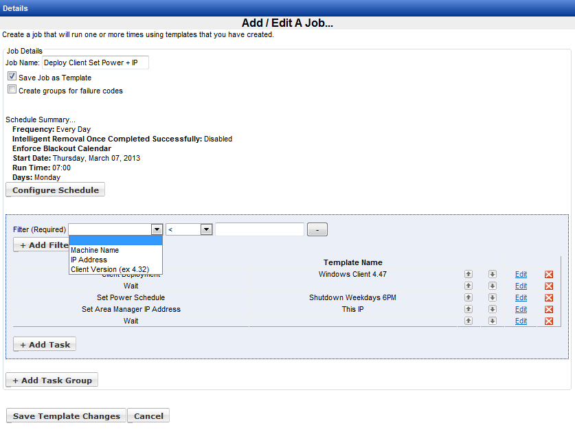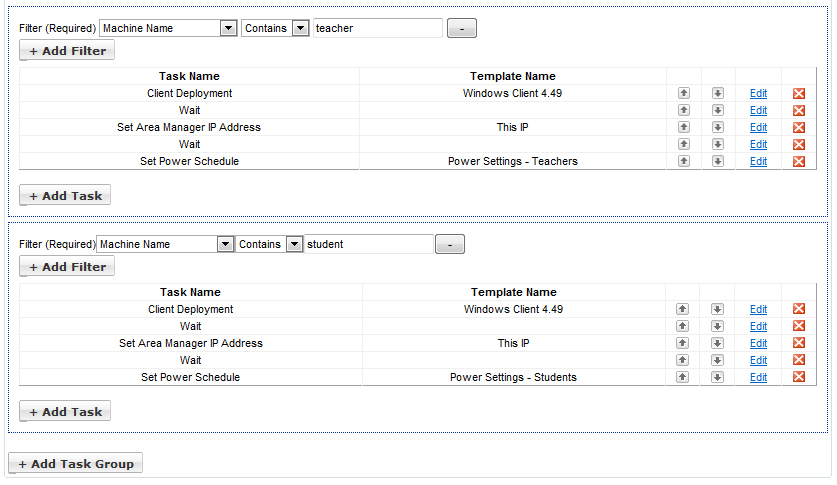 Click the Add Task Group button to define an additional group of tasks using different filter options. For example, an IP address range may contain a mix of teacher and student systems that can be identified by machine names containing “teacher” or “student”. If you would like to apply different power settings to each type of system, you can set up a single job to do that by using filtering options. In this example there are two task groups, and the differences between them are in the filter setting and the template used by the Set Power Schedule task.