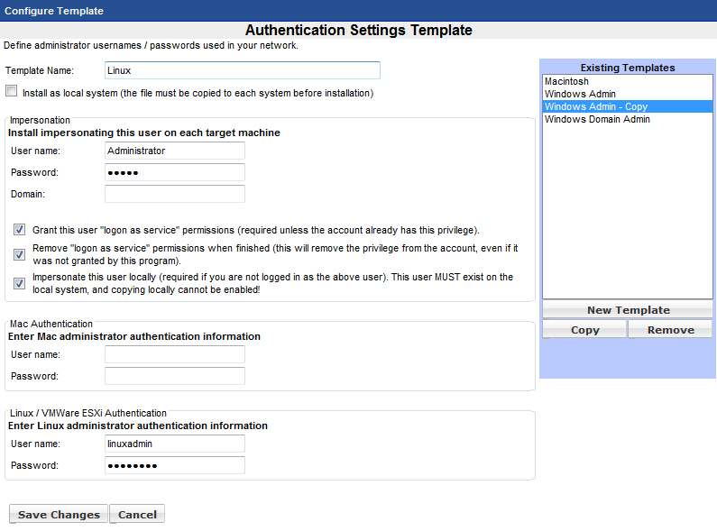 For deploying to Linux systems you keep the Windows administrator information to access the Windows share where the Linux apps are stored for deployment, then enter the username and password that is a system admin on each of the Linux target systems. You can use the same authentication template for VMWare ESXi if the authentication credentials are the same, or you can create a separate template.
