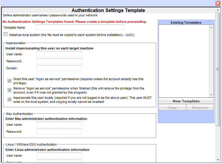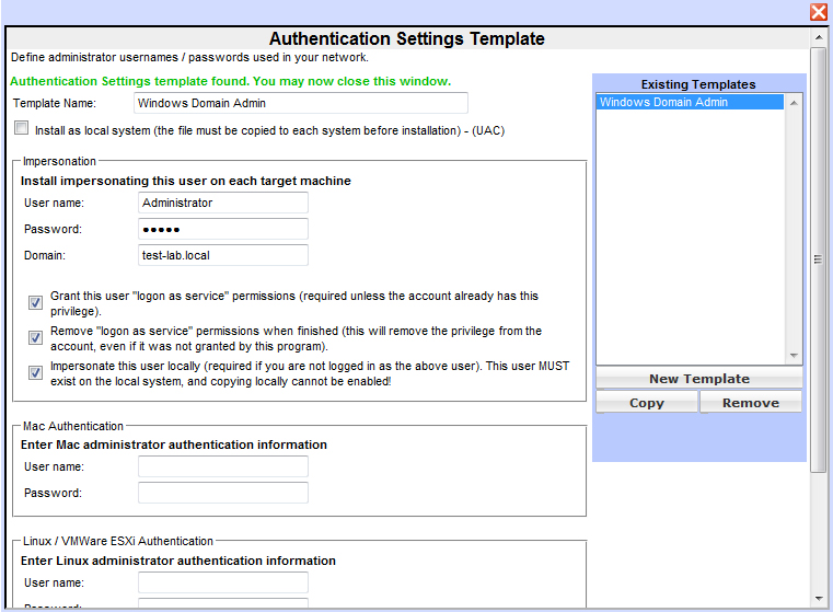 Enter a Template Name, Username, and Password (and Domain, if using a domain administrator account), then press Save to save your template. Click on the top right hand corner X to close the window and continue.