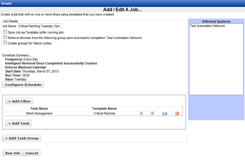 You can modify the details of the job if needed. Click the Run Job button to schedule the Critical Patching job to the group called Test Automation Network.