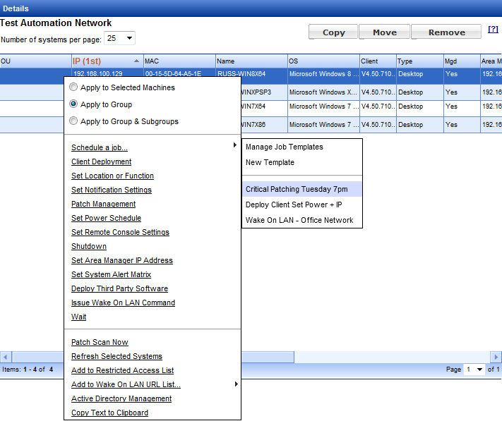 Now that we have the Critical Patch Job template set we can apply the job template to systems that have Clients and are managed by the System Area Manager.