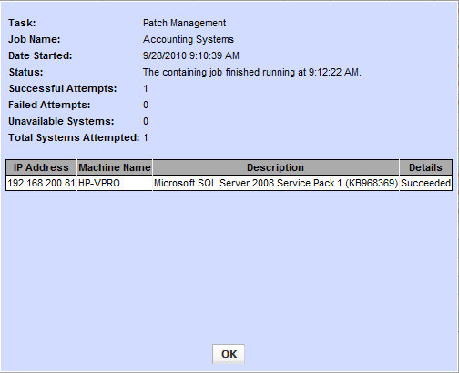 Once the Patch Management job has completed you can view the details in the Status window.