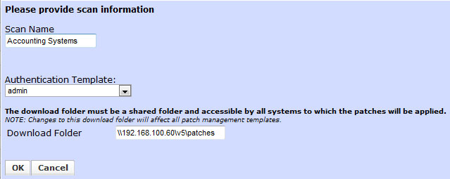 This brings up a window that allows you to define the scan name and authentication template to be used to access the target systems and to set the network shared path to the folder where you wish to store the identified patches. Change the settings as required and press the OK button to perform the scan. (Please note that for environments where User Account Control is enabled on Windows systems, patch scans and deployments should use the local admin authentication template.)