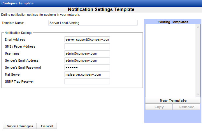 System alert notifications (see System Alert Matrix, below) can be sent via email or abbreviated email to your cell phone (SMS). Specify the addresses for these notifications, and enter authentication information for your mail server to allow the emails to be sent. You can also specify an IP address where you monitor SNMP traps.