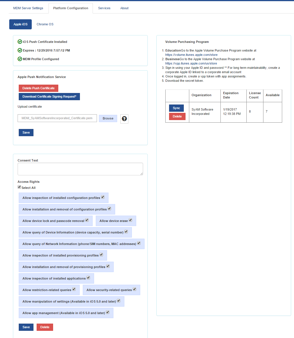 In order to be able to manage iOS devices you must have a Apple Push Certificate created and installed on the Management Utilities and a VPP Token must be installed if yo wish to install APPS onto your iOS devices.