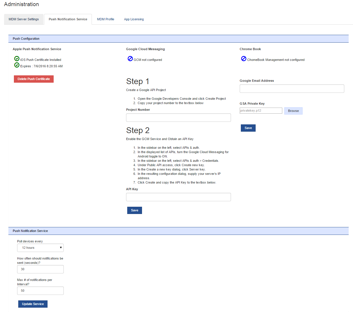 - Click the upload Apple Push Certificate Button