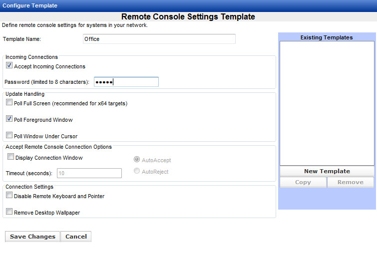 Software Deployment & ConfigurationTemplates Remote Console Remote Console Settings Template You can configure systems to accept or deny remote console connections. Settings can be applied according to bandwidth and security requirements.