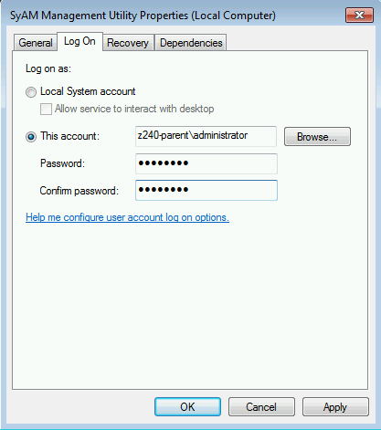 Select Identity and press the button next to Local System to change it.