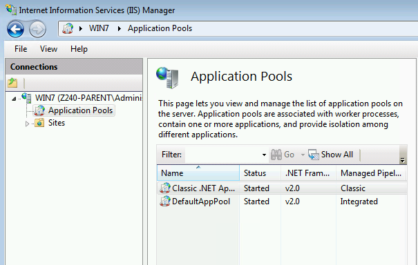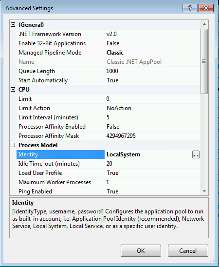 Finally go to IS Administration and Change the IIS Application Pool - Select Classic .Net and choose the Advanced Settings on the right hand menu.