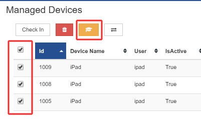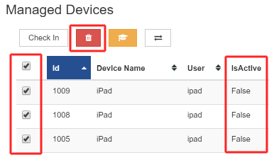 Now the devices have been un-enrolled you will see their IsActive status change to false - select the devices to remove by clicking on the check boxes and the the red remove icon