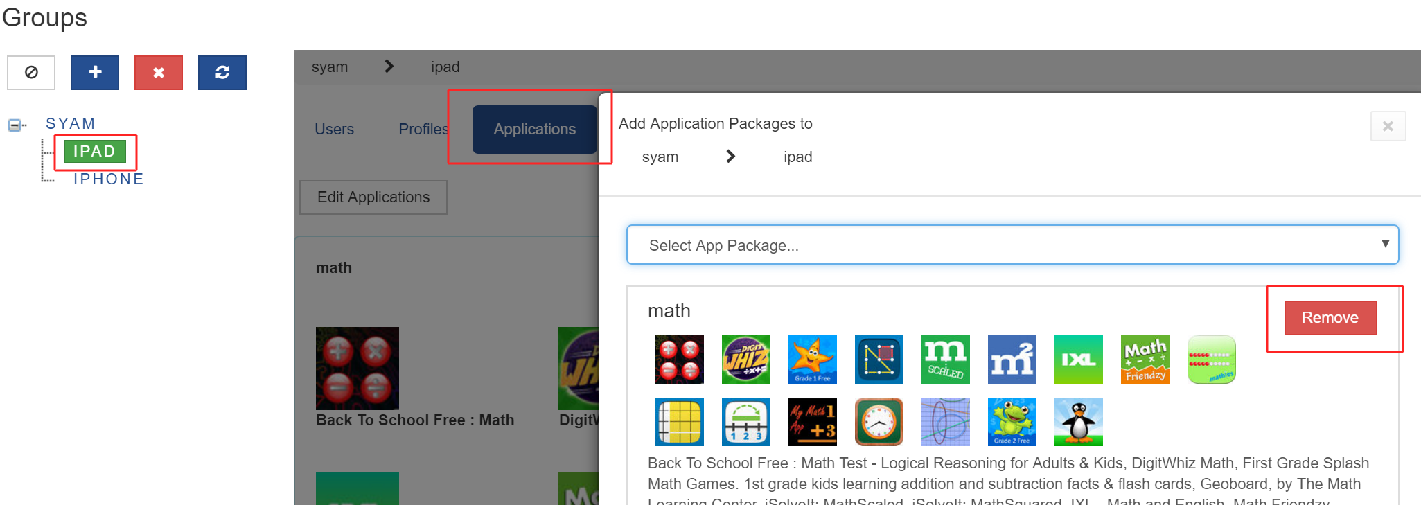 Select the Group, Applications Tab and then press the Remove button next to the App Package to wish to remove from the group.