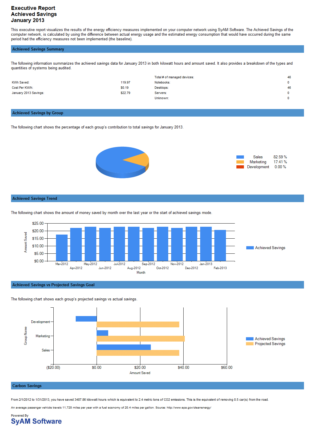The Executive Report becomes available in Achieved Savings mode. Like the Achieved Savings summary and detail reports, it does not appear in the menu while you are still in Identified Savings mode. The Executive Report summarizes achieved savings results for the selected month and year, displaying savings by group, the trend in amount of money saved, how achieved savings compares with projected savings, and a summary of carbon savings for the month. It can be produced in HTML or PDF format.