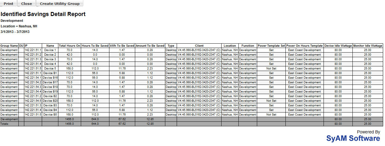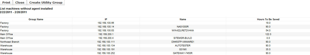 For these two report types, and for all the detail reports, clicking the Create Utility Group button will copy the listed machines into a Management Utility group identified by the date and time of creation. The groups can then be used for deploying the agent and the desired power settings.