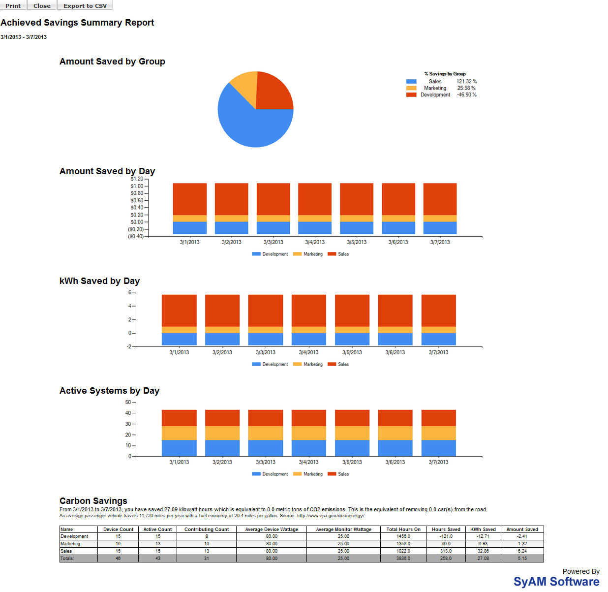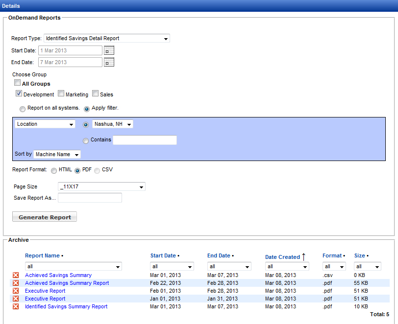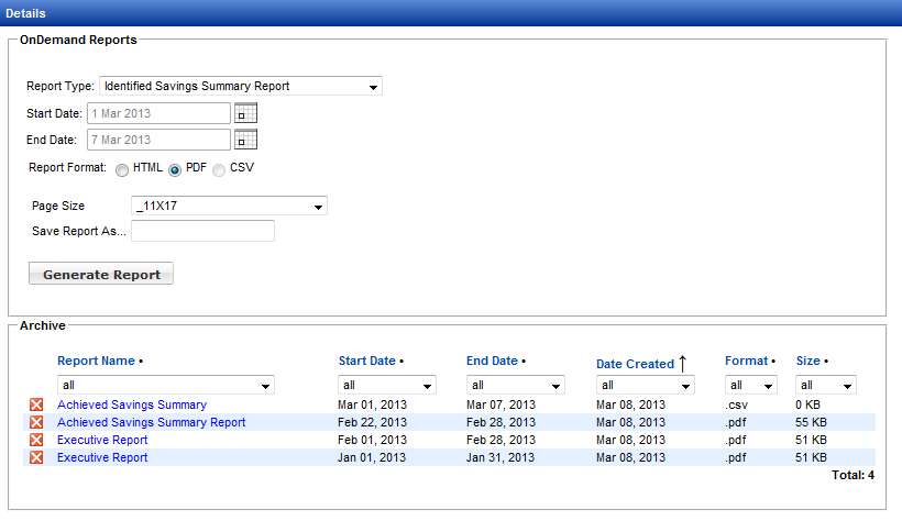 Achieved Savings Summary Reports and Achieved Savings Detail Reports can be exported to comma-separated values (CSV) files which can be opened by a spreadsheet application. The CSV option can be selected when the report is created; there is also a button in the HTML report that will perform the export to CSV. The CSV reports are stored in the archive in the same way as PDF reports.