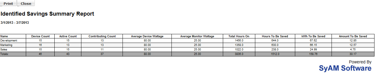 Identified savings reports, both on-demand and email, contain the following information (per group and totals):