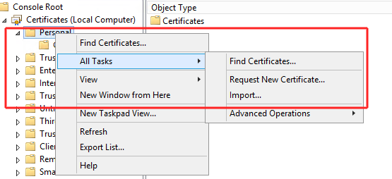 Select Personal Certificate - Right Click to open up the menu, select All Tasks and choose Import