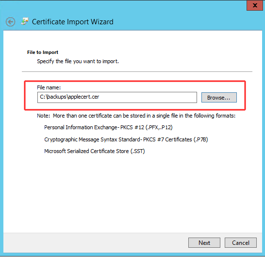 Select the Trusted Root MDM Certificate file - enter the password used when exporting the certificate.