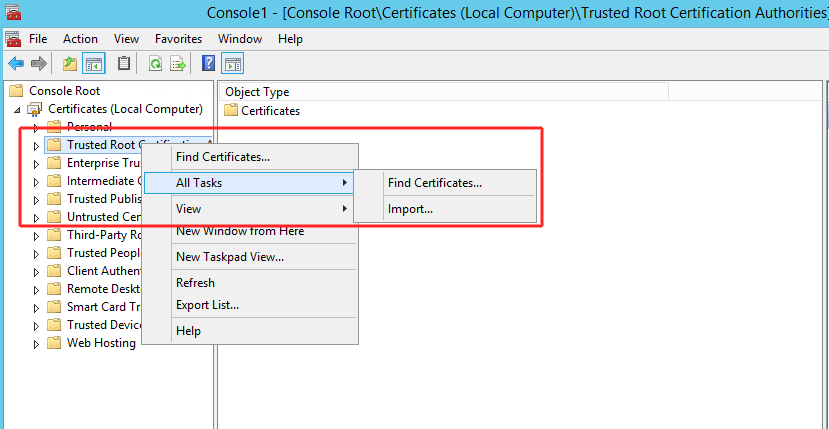 Select Trusted Root Certificate - Right Click to open up the menu, select All Tasks and choose Import