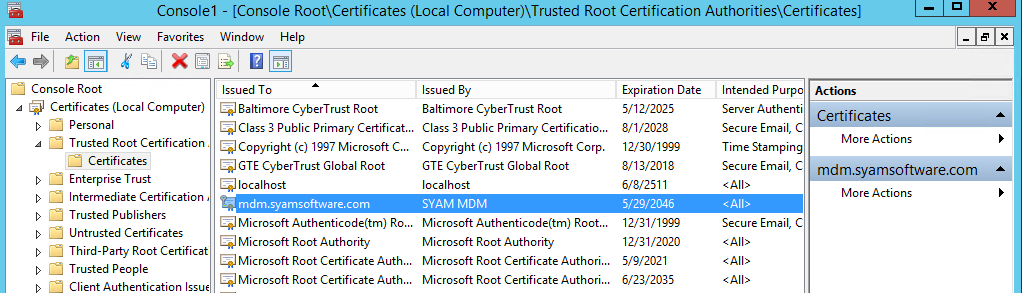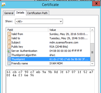To get your certificate cert hash which is required for the binding command double click on the MDM Certificate within Trusted Root Certificate