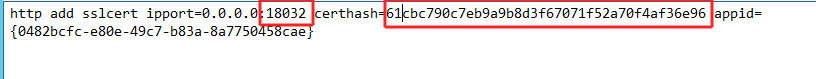 http add sslcert ipport=0.0.0.0:18032 certhash=61cbc790c7eb9a9b8df67071f52a70f4af36e96 appid={0482bcfc-e80e-49c7-b83a-8a7750458cae}