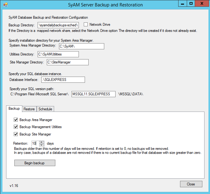 The SyAM Backup & Restore application provides the ability to easily backup and restore the data and associated files for the SyAM System Area Manager, Management Utilities and Site Manager.