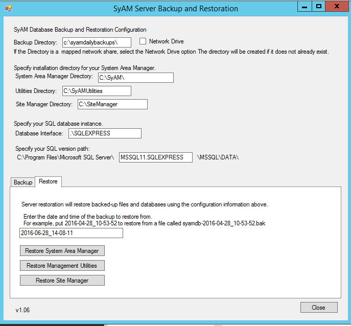 •The field in the restore tab is the date that a backup occurred. The syntax is derived from the syamdb.bak file (ex. syamdb-2016-06-28_14-08-11.bak), the input would look like