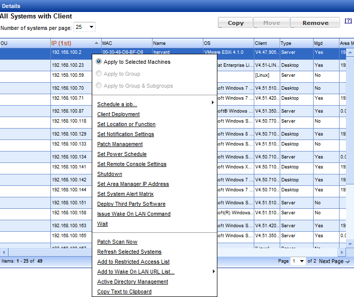 Select one or more Details panel rows, then right-click to display a menu of actions that can be taken. The action is applied by default to the selected system(s) but you can choose instead to take an action on the entire group, with or without its subgroups. Further details of specific job actions are given in other sections of this manual.